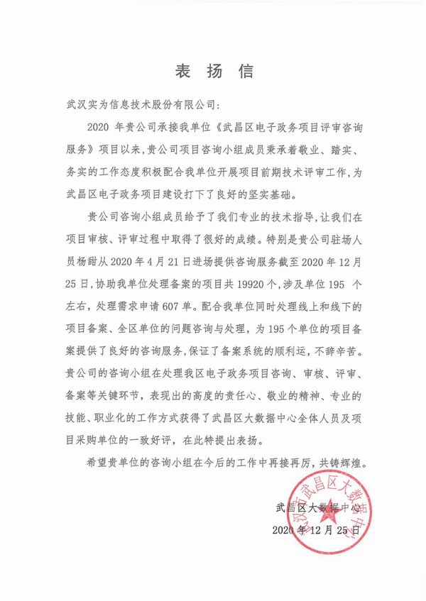 實(shí)為公司獲得武昌區(qū)大數(shù)據(jù)中心表揚(yáng)